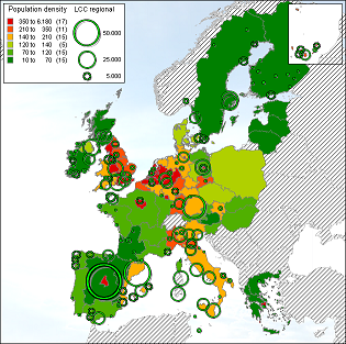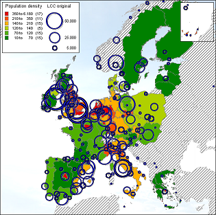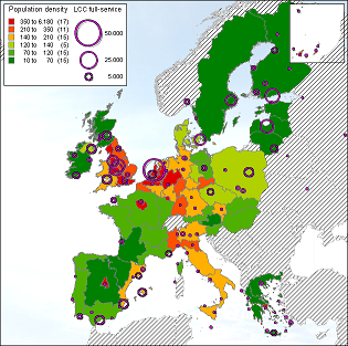 By combining population densities with the possible presence of low-cost carriers, one can analyze to what extend low-cost carriers fly on areas with a high population density. Population data is used from Eurostat (2006) and contains information from 2003, at the moment of research this was the year with the most complete data on different European countries. Countries lacking data and in which low-cost carrier could operate have been excluded from the related analyses.