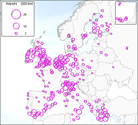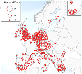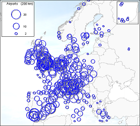 More information on the results of the buffer analysis can be found here. Also to be found there is information on different top 20s of airports with most other airports located within the 200-kilometer buffer zone. One needs to keep in mind the different restrictions of this buffer analysis. The analysis is carried out with only the airports on which a low-cost carrier operated in 2005, alternative airports on which possible a low-cost carrier could fly have been left out. Another restriction is the landside accessibility that has not been taken into account. In case of the LCC full-service type the airport on the Greek isle Santorini has a high value, although in reality it is very inaccessible and therefore offers almost no competition for the surrounding airports. Because of lacking data these factors where left out of the analysis.