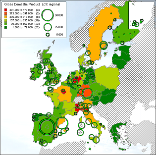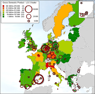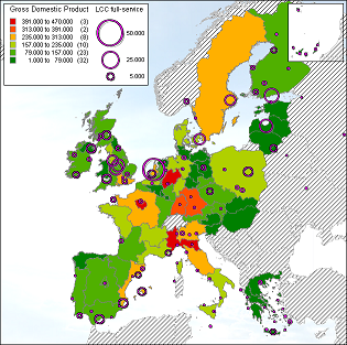 To get an idea about the economy of regions on which low-cost carriers fly, the presence of a low-cost carrier, expressed in the number of seats, will be related to the gross domestic product (GDP) of the region. GDP data is from 2003, capacity data in number of seats is from September 2005.