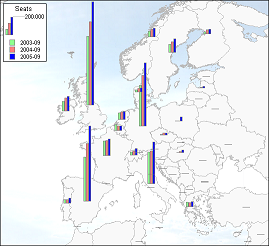 Figure 43 gives an overview of the number of low-cost carrier seats per country for the years 2003, 2004, and 2005. Great Britain, Germany, Spain, and Italy, have the highest number of low-cost carrier seats. East Europe has relatively the strongest growth in number of seats. When looking at the data for each country individually some exact numbers can be found (information can be found and downloaded here), this will strengthen the differences in the figures above. Great Britain has the highest number of low-cost carrier flights with a total of 7.867 flights, followed by Spain with 4.897 flights and Germany with 4.429 flights.