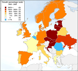 The number of low-cost carriers per country, both absolute and relative, is visualized in figure 42 for the years 2003, 2004, and 2005. In 2005 almost all countries know an increase in the number of low-cost carriers. Ireland and Norway have a small increase in the number of low-cost carriers. East Europe, especially Czech Republic, Poland, and Hungary, know a relatively strong growth.