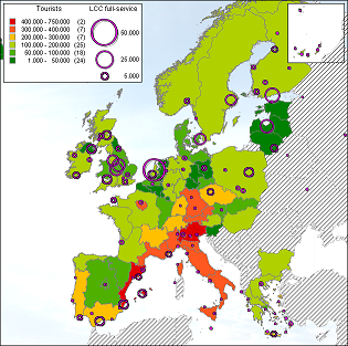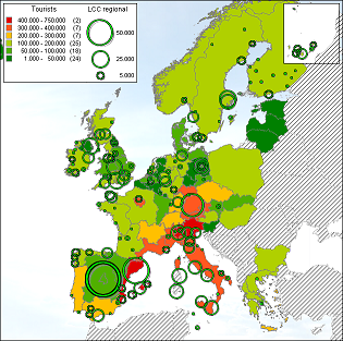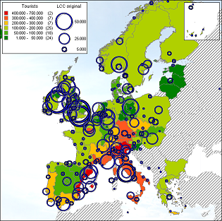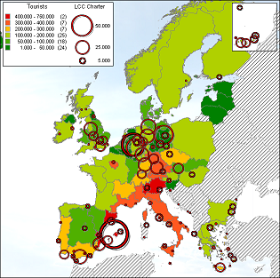 The relation between tourism and the presence of low-cost carriers can be analyzed by combining both in a GIS. Data about tourists comes from Eurostat and contains data from 2002. Tourism from within the nation has been left out.