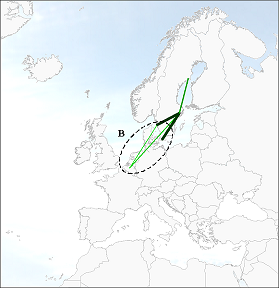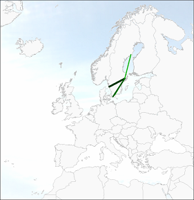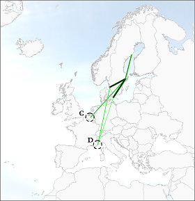 In September 2004 the whole network of Malmo Aviation intensivied, including the recent international routes towards Belgium (point B, figure 52). In September 2005 the intensity of the whole network decreased a little, and one route towards Antwerp was abandoned (point C). The network expanded further towards more tourist destinations (point D).