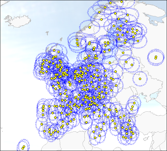 Different situation characteristics will be analysed by using a buffer analyses tool in MapInfo and combining different map layers. By implementing buffer zones of 200 kilometres around airport locations it will become possible to count the number of other potential competing airports, which are located within the 200-kilometre zone (see figure 23). This could be done for each low-cost carrier type.